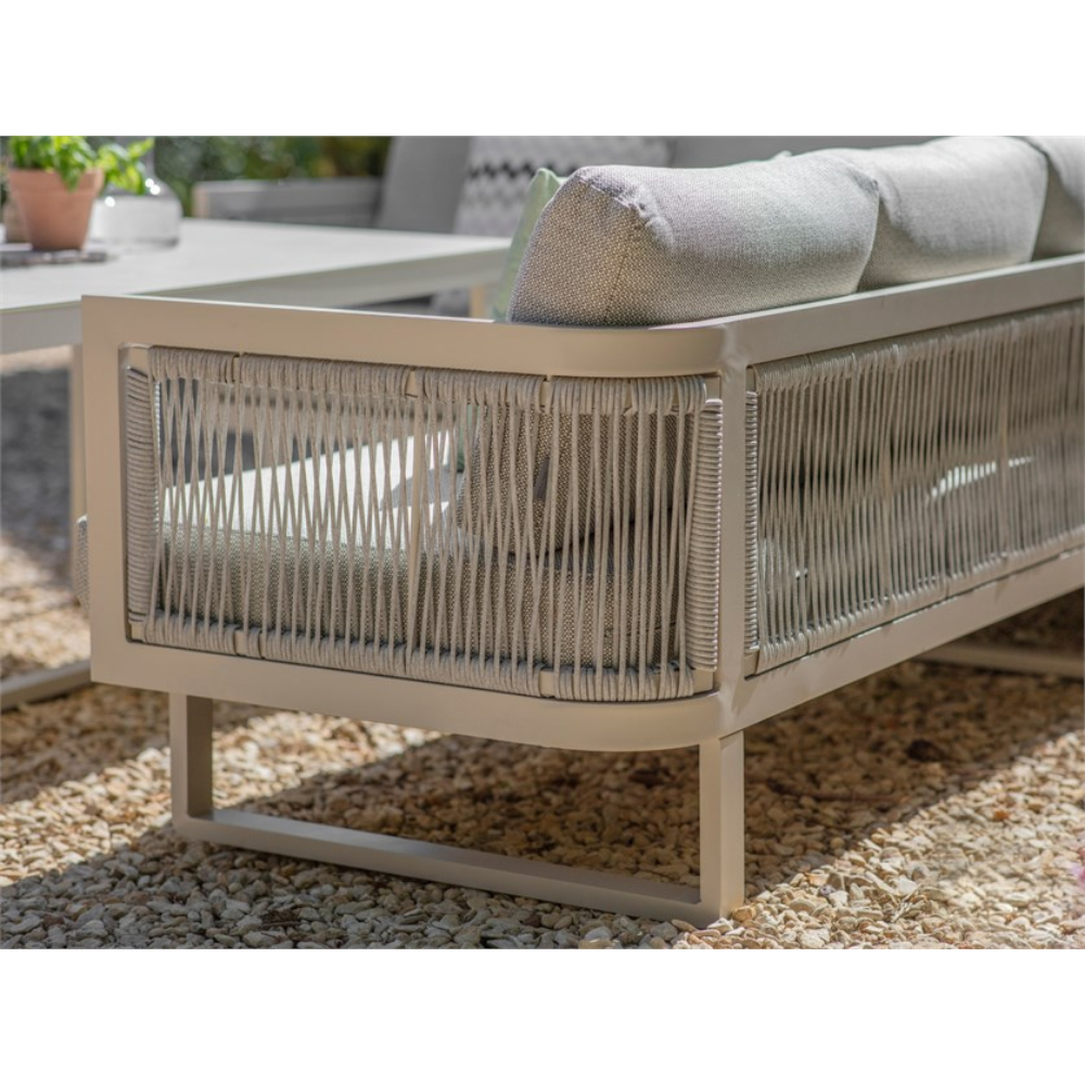Generously sized and sociable, the Hudson sofa set is effortlessly cool, easy to care for with a bold shape that mixes aluminium with outdoor rope for a dramatic design.